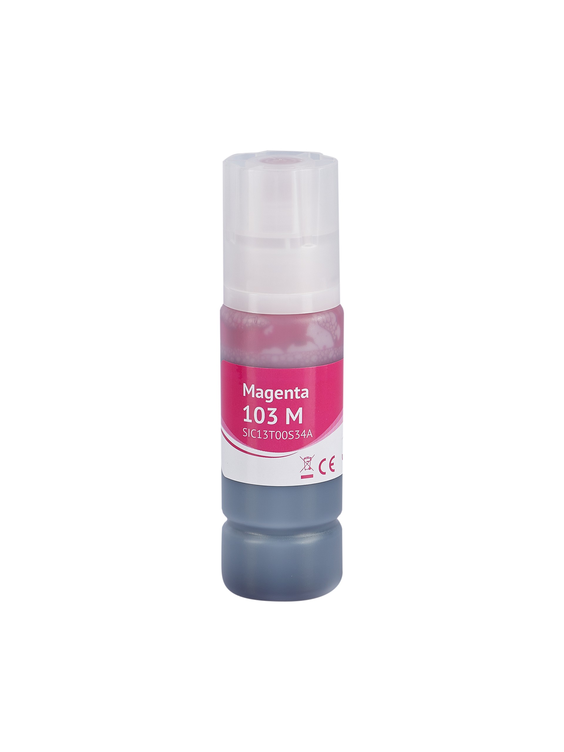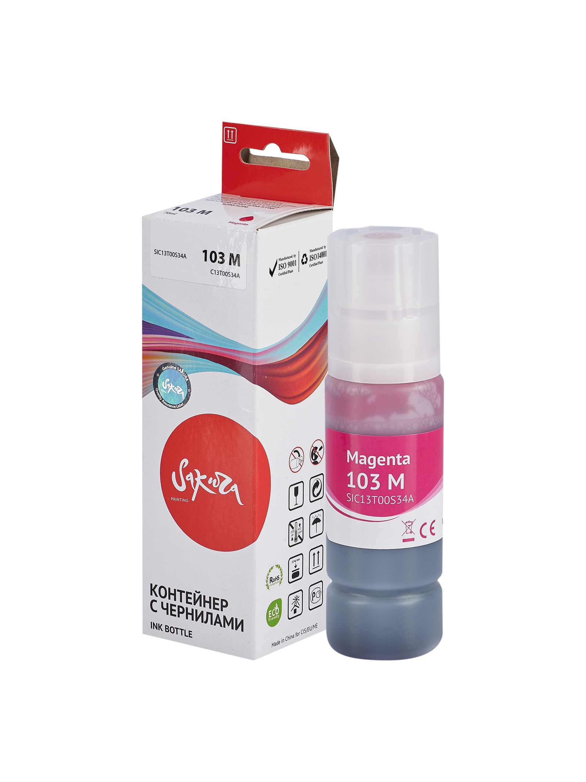 Контейнер с чернилами Sakura C13T00S34A (103 M) для Epson EcoTank L1110/1210/1250/3110/3111/3116/3150/3151/3156/3160/3210/3211/3250/3251/3256/3260/3266/5190/5290/5296, пурпурный, водорастворимый тип, 70 мл., 7500 к.